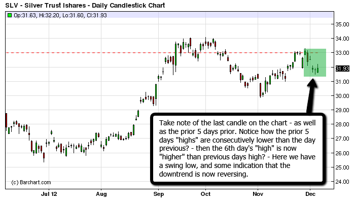 In any case – the swing low. I’ve included the following chart of SLV (a silver ETF) with hopes of pointing it out. Let me try to explain this in as simple a way as I can.