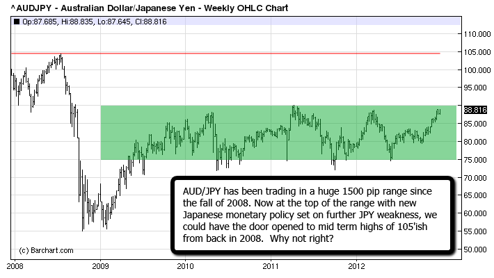 The beauty of this setup is the asymmetric risk profile. Japan has explicitly stated they want inflation at 2% and a weaker currency to boost exports. They’re not fighting us – they’re practically begging us to short their currency. When was the last time you had a central bank literally telling you which direction to trade? This is why I’m structuring my entire 2013 strategy around yen weakness. The Bank of Japan is doing the heavy lifting for us.