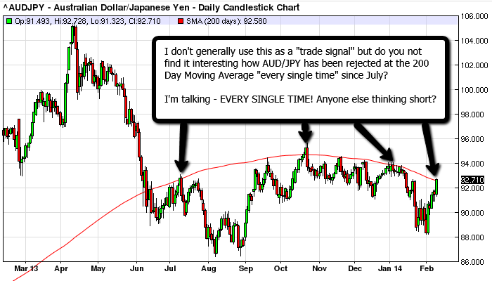 The Australian Dollar ( which generally trades” along side risk” ) just had a brief meeting with its old friend the 200 Day Moving Average and guess what?